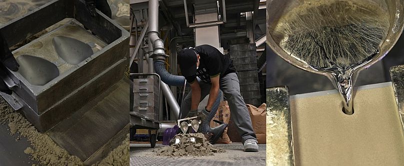 La technique de moulage au sable, vieille de 100 ans, ne nécessite aucune cuisson ni produit chimique. Tout d’abord, les moules en bois sont recouverts d’un mélange de sable, d’huile et d’eau. Le moule est ensuite retiré et le cadre en sable nouvellement posé est rempli de métal en fusion.
