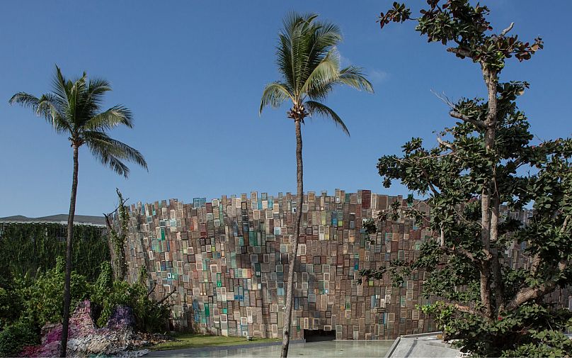 L’extérieur du club de plage de l’hôtel à côté est encore plus frappant, construit complètement à partir de volets en bois récupérés, récupérés de travers Java, et le toit est au toit de chaume sur 5 000 tongs collectées sur le rivage.