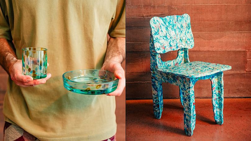 Ensuite, il y a les innombrables objets que nous tenons pour acquis dans les hôtels, les bouteilles de savon, les bouteilles de shampooing rechargeables, les sous-verres et le verre et les ustensiles de cuisine, qui sont tous fabriqués à partir de plastique collecté et transformés en produits dans leur studio de déchets.