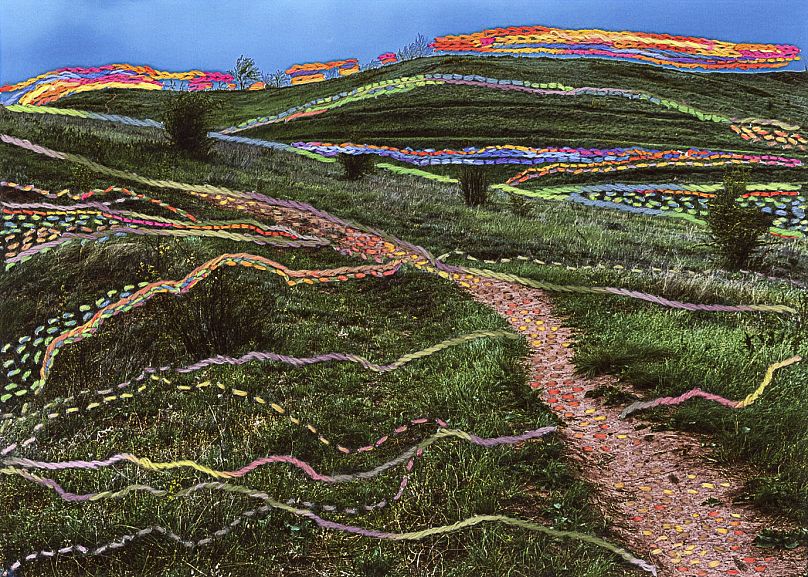 Sa démarche artistique consiste à coudre méticuleusement des broderies colorées sur ses propres photographies.