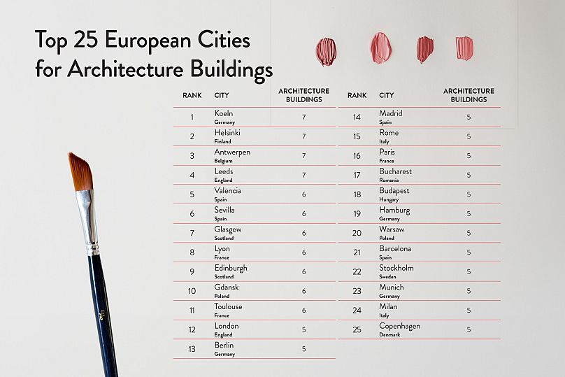 Londres bascule à la 12e place, dépassée par des villes comme Lyon, Glasgow et Valence pour les meilleures villes pour l’architecture. Cologne occupe la première place, se démarquant avec des bâtiments conçus par des architectes célèbres, comme l’imposante mosquée centrale de Cologne ou la tour de Cologne.