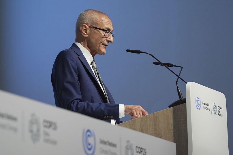 John Podesta, l'envoyé américain pour le climat, s'exprime lors d'une conférence de presse à la COP29.