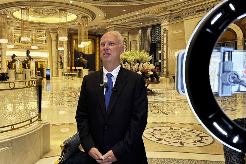 Kirill Dmitriev, le chef du Russian Direct Investment Fund, parle aux journalistes de l'hôtel Ritz Carlton à Riyad, Arabie saoudite, mardi 18 février 2025