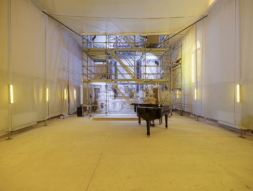 La vitrine de l’Opéra Aperta de Holy See, hébergé dans une église vénitienne décorcée dans le district de Castello, a reçu une mention spéciale pour transformer l’espace en un site en évolution de soins collectifs, de restauration et de dialogue, inspiré du philosphère italien Umberto Eco Book de 1962 « Open Work (Opera Aperta) ».