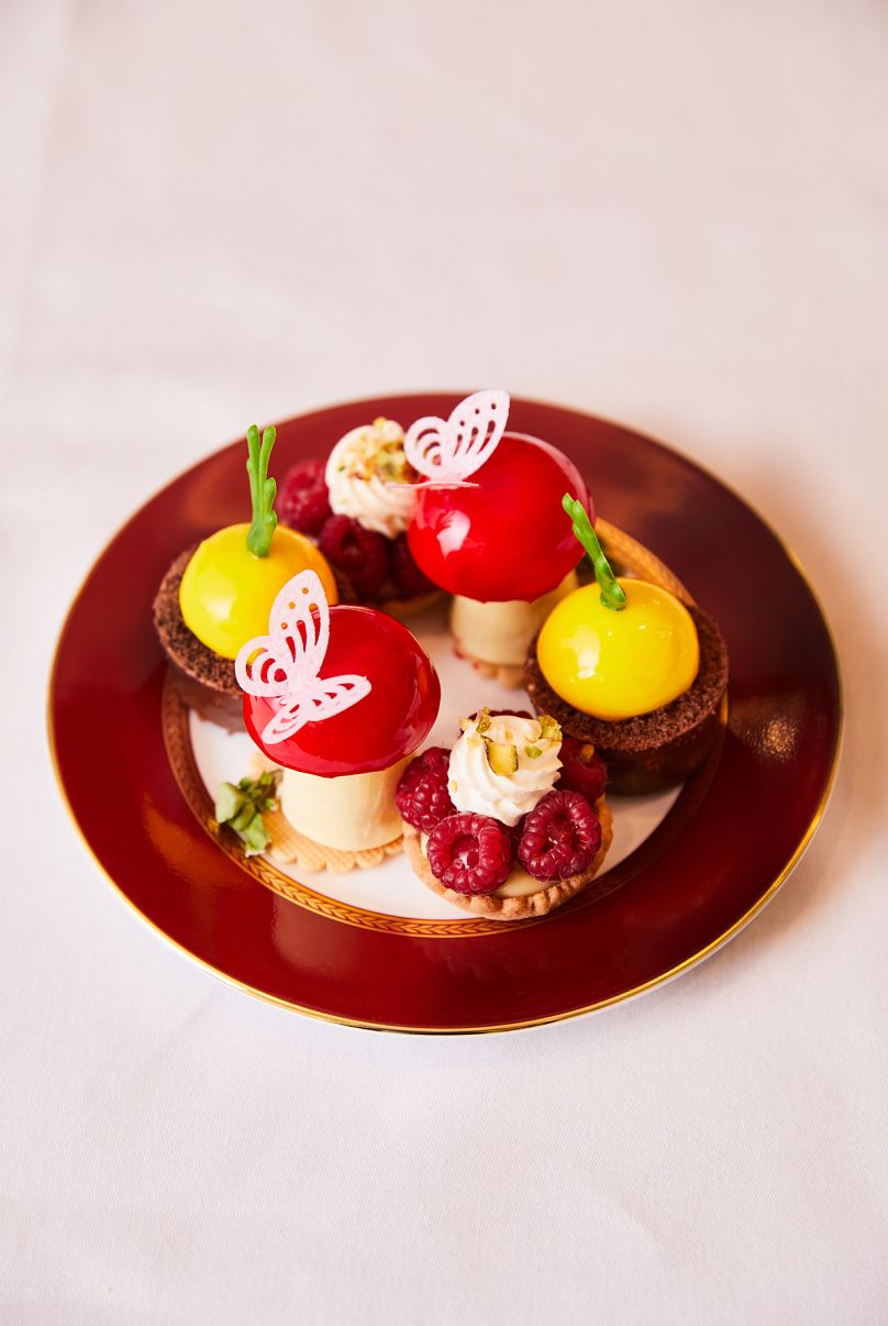 Du macaron au chocolat et aux groseilles aux œufs Drumkilbo, le menu innovant du Mayfair offre une touche française unique au thé traditionnel britannique de l’après-midi. Il existe également des options alternatives sans noix, sans gluten et végétaliennes, notamment le « poulet » de couronnement végétalien et le fromage à la crème.