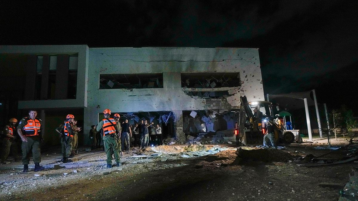 Israeli military and police work at a damaged school building that was hit by missiles fired from Iran in Gadera, Israel.