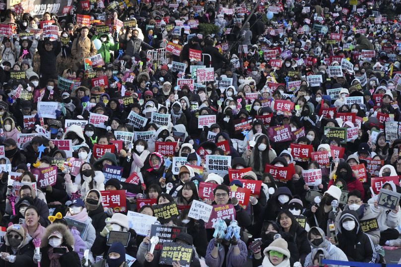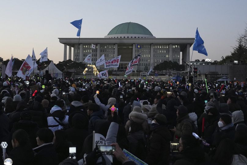 La foule des manifestants brandissait des bâtons lumineux, ce qui est normalement courant lors des concerts de K-pop. Beaucoup d’autres sont restés dans la région et ont continué à célébrer jusque tard dans la nuit.