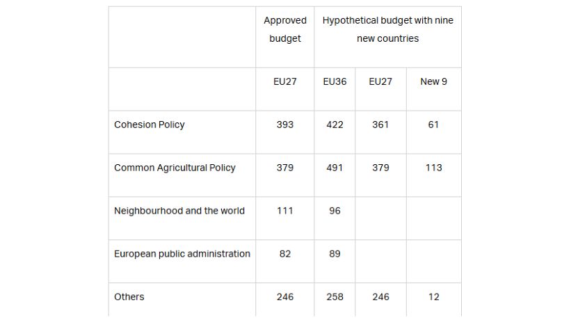 Globalement, un élargissement potentiel à 36 États porterait le budget total de l’UE de 1 211 milliards d’euros à 1 356 milliards d’euros.