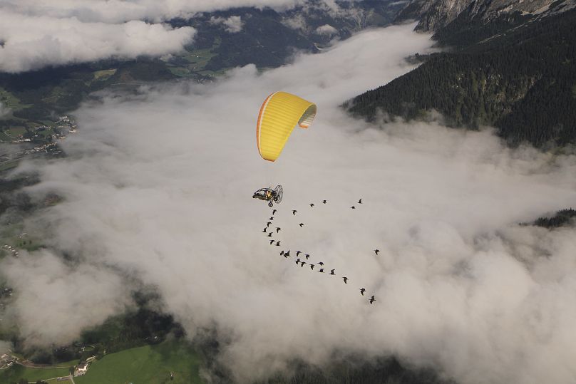 C’est une scène étrange : l’avion ressemble à un kart volant avec un ventilateur géant à l’arrière et un parachute jaune qui le maintient en l’air. Pourtant, trois douzaines d’oiseaux suivent l’engin, piloté par Fritz, alors qu’il vole au-dessus des prairies alpines et des contreforts.