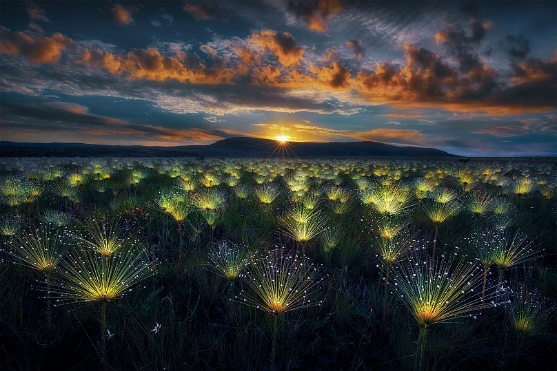 L’image capture les plantes de Paepalanthus brillant pendant le coucher du soleil dans des plateaux Veadeiros au Brésil.