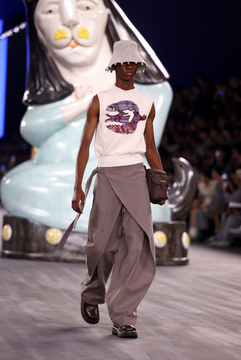 Le directeur créatif Jones, connu pour ses inspirations culturelles, a poursuivi cette tradition avec des motifs d’oiseaux sur des vestes ajustées et des chapeaux fluides ornés de félins nus allongés. La collection met également en valeur des silhouettes aériennes et des pastels sourds rappelant la céramique émaillée, accentués par des coupes innovantes et des juxtapositions d’éléments délicats et forts.