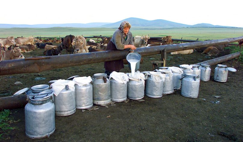 Natasha Pryamorukova collecte du lait dans un village de Gorelovka, à environ 250 kilomètres (150 miles) au sud de la capitale géorgienne Tbilissi, le 31 juillet 2005.