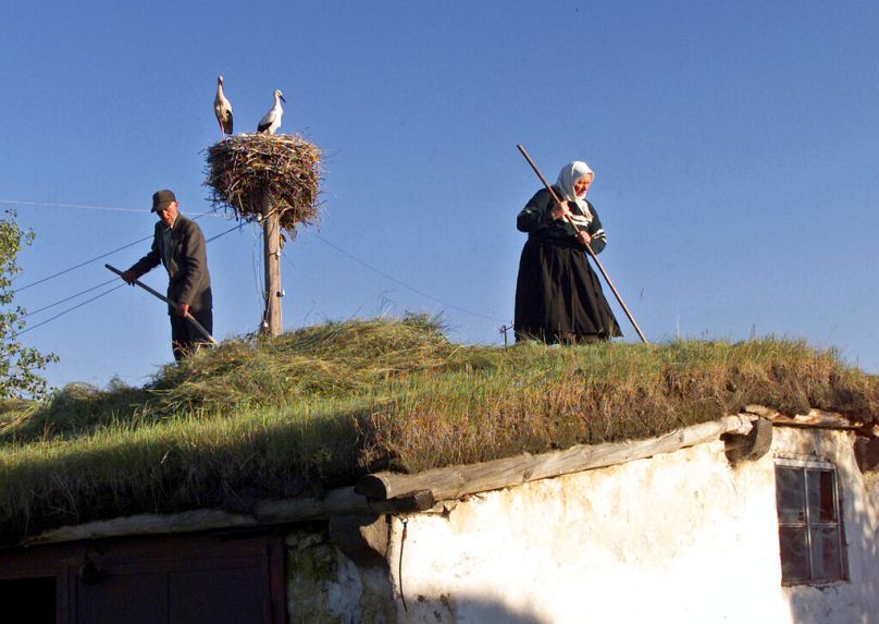 DOSSIER - Vassilii Kalmykov, 70 ans, et sa femme Lukerya, 68 ans, ramassent de l'herbe sur le toit d'un hangar dans un village de Gorelovka en Géorgie, le 31 juillet 2005.