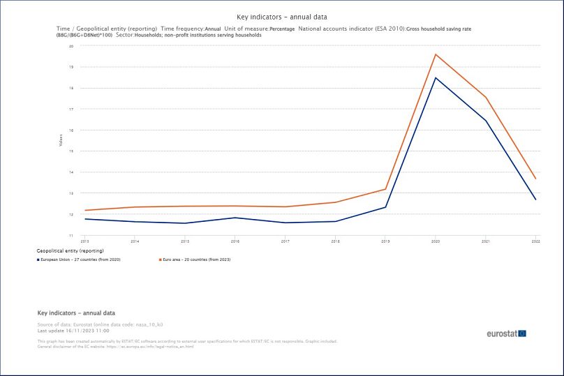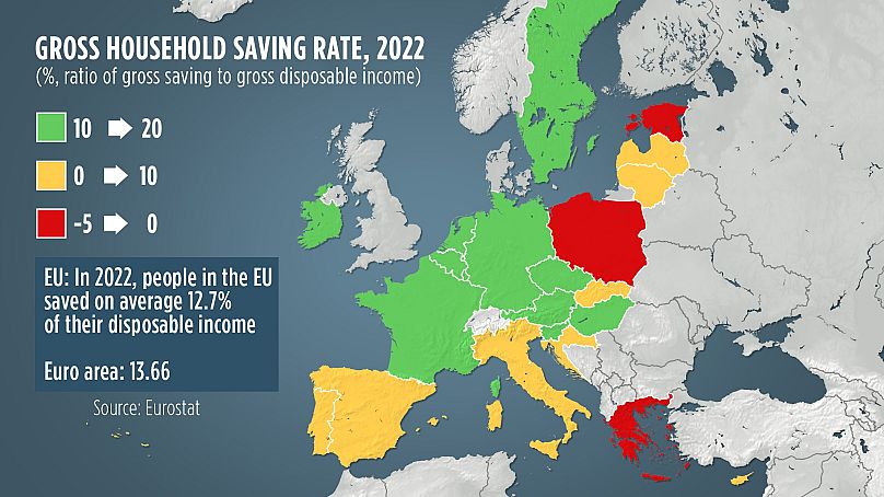 En 2022, les ménages de l’UE ont épargné en moyenne 12,7 % de leur revenu disponible, alors que le taux dans la zone euro était plus élevé, à 13,7 %.