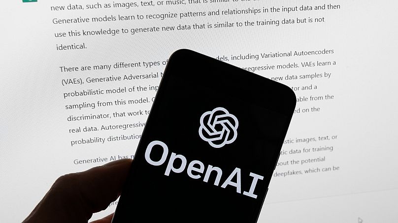 Le logo OpenAI est visible sur un téléphone portable devant un écran d’ordinateur affichant la sortie de ChatGPT