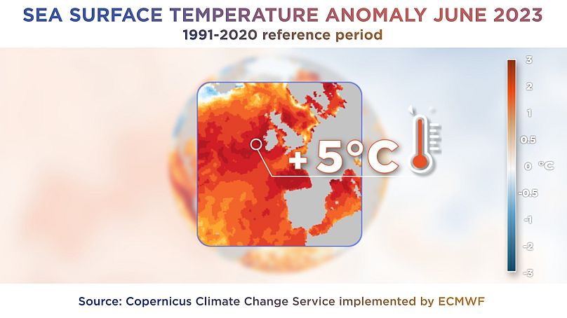 L’eau a culminé à cinq degrés au-dessus de la moyenne à l’ouest de l’Irlande – atteignant des températures auxquelles on s’attend normalement à la fin de l’été, plutôt qu’en juin.