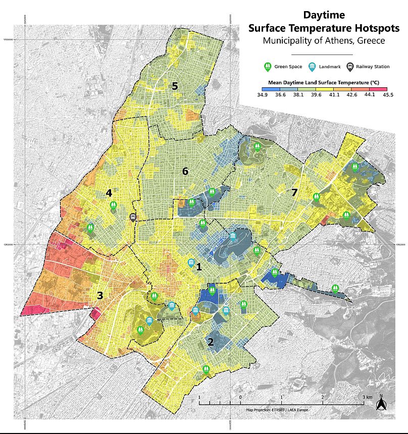 Avec ses immeubles blancs qui s’étendent jusqu’à l’horizon, Athènes est l’une des villes les plus densément construites d’Europe, et aussi la plus chaude, avec un effet « d’îlot de chaleur urbain » marqué.