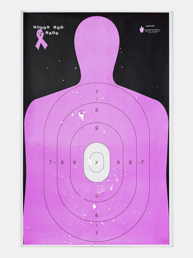 J’ai toujours voulu faire un commentaire sur la culture des armes à feu, il me fallait donc trouver une manière de le faire. C’est donc devenu un nouveau projet et au lieu d’aller chez eux et de photographier leur collection d’armes sur la table de la cuisine, ce que j’aurais probablement fait normalement, j’ai décidé d’en faire un concept. Je suis revenu six mois plus tard. J’ai passé dix jours au club de tir et j’ai interrogé un large éventail de personnes sur les raisons pour lesquelles elles y étaient allées et ce que les armes à feu représentaient pour elles. C’était complètement anonyme. J’ai ramené leurs cibles à Londres. Beaucoup d’entre eux n’étaient vraiment pas PC, ils étaient plutôt décoratifs et c’est devenu un projet à plusieurs niveaux.