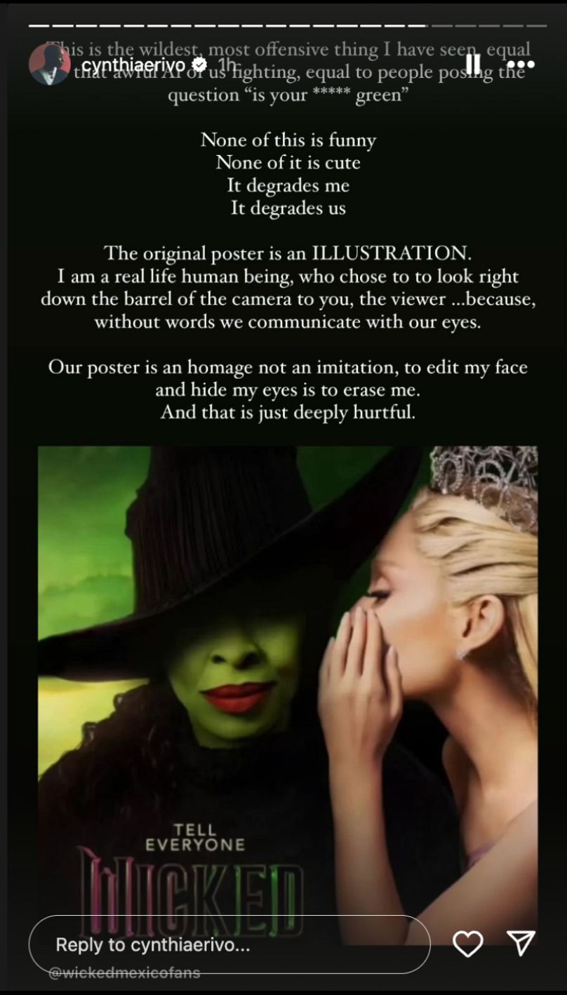 L’actrice britannique Cynthia Erivo s’en est prise à un fan qui avait modifié numériquement son image depuis le Méchant affiche du film, le qualifiant d’« offensant » et de « profondément blessant ».