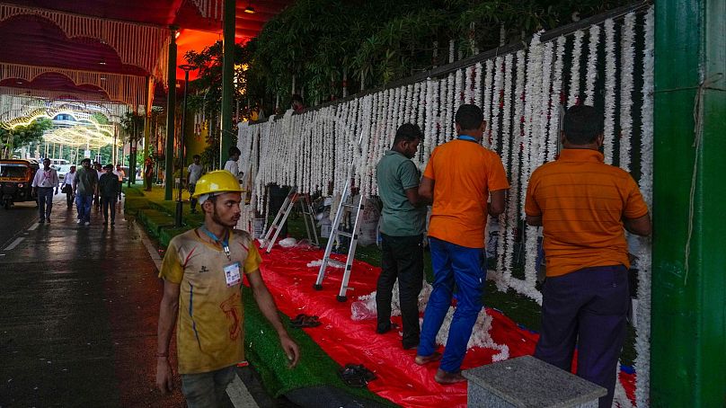 Les ouvriers décorent le lieu avant le mariage du fils du milliardaire Mukesh Ambani, Anant Ambani, avec Radhika Merchant au Jio World Convention Centre