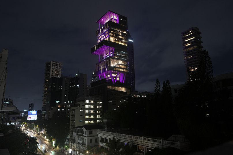 Le manoir Antilia, la maison du milliardaire Mukesh Ambani, alors qu’il est illuminé avant le mariage de son fils Anant Ambani et de Radhika Merchant à Mumbai, en Inde