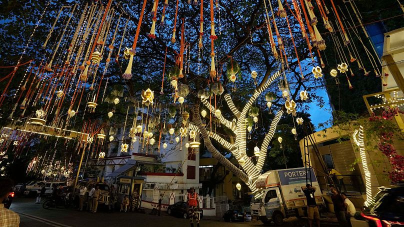 Les gens passent devant la salle décorée de lumières avant le mariage du fils du milliardaire Mukesh Ambani, Anant Ambani, avec Radhika Merchant au Jio World Convention Centre à Mumbai