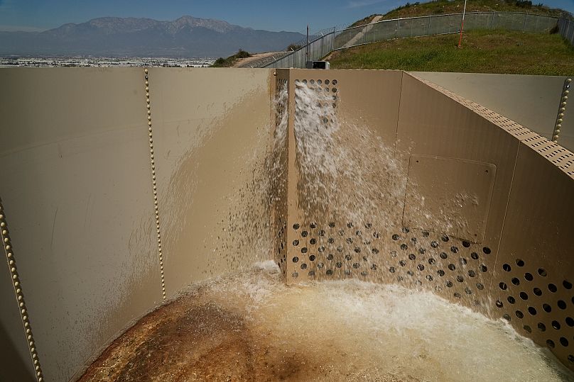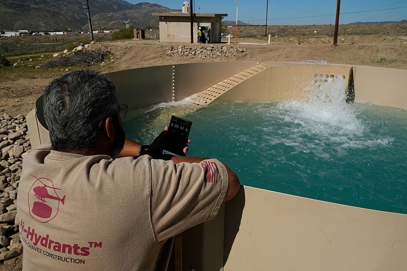 Sur un complot éloigné dans la ville de Cabazon du sud de la Californie, l’entrepreneur Glenn Chavez s’est tenu sur une échelle et a regardé dans un hélice vide. Une radio à la main, il a cliqué sur un bouton pour activer le système et a regardé l’eau rugir dans le réservoir. En environ six minutes, il a rempli 32 176 litres.