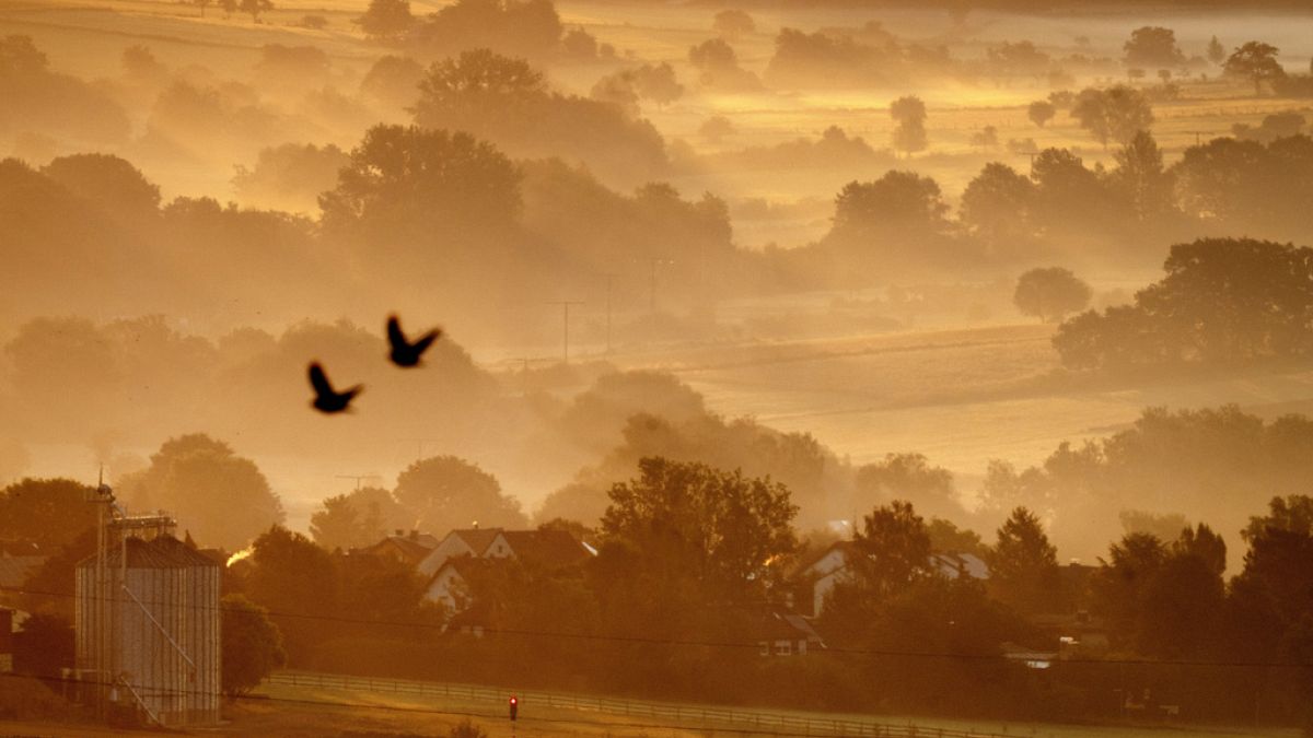 Birds fly over fields in Wehrheim near Frankfurt, Germany, as the sun rises on Monday, July 29, 2024.