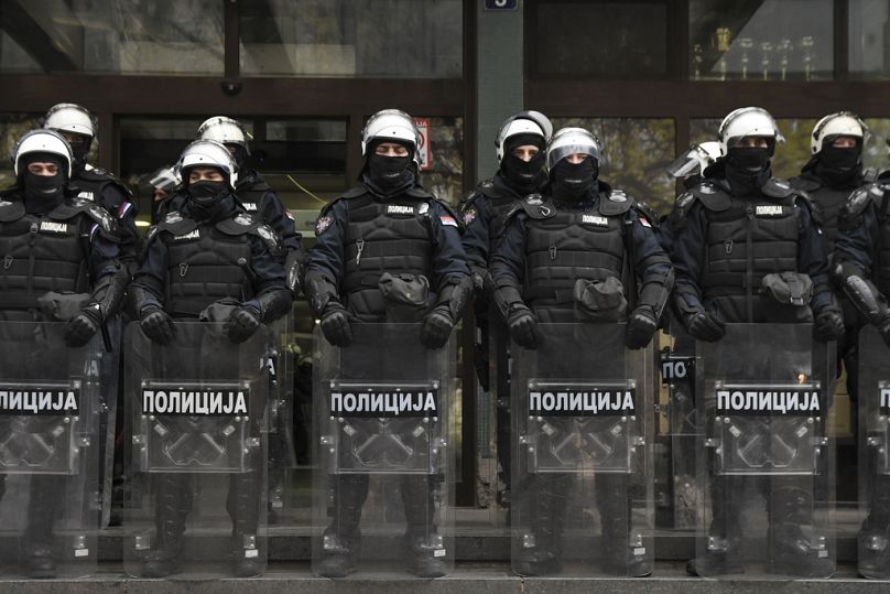 Des policiers serbes gardent un palais de justice lors d'une manifestation antigouvernementale exigeant des arrestations suite à l'effondrement mortel du toit d'une gare de Novi Sad, le 20 novembre 2024.