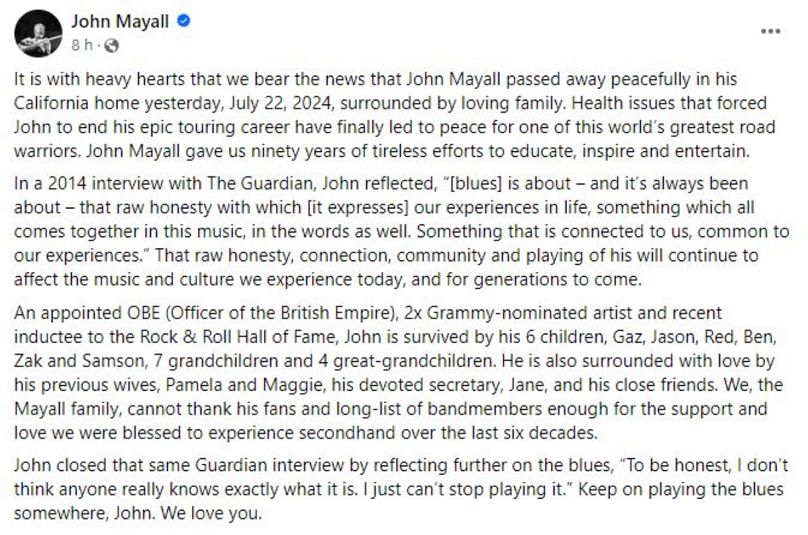 Le décès de Mayall a été annoncé par sa famille sur Facebook : « C’est avec le cœur lourd que nous apprenons que John Mayall est décédé paisiblement dans sa maison californienne hier, le 22 juillet 2024, entouré de sa famille aimante. Les problèmes de santé qui ont forcé John à mettre un terme à sa carrière de tournée épique ont finalement conduit à la paix pour l’un des plus grands guerriers de la route au monde. John Mayall nous a donné quatre-vingt-dix ans d’efforts inlassables pour éduquer, inspirer et divertir. »
