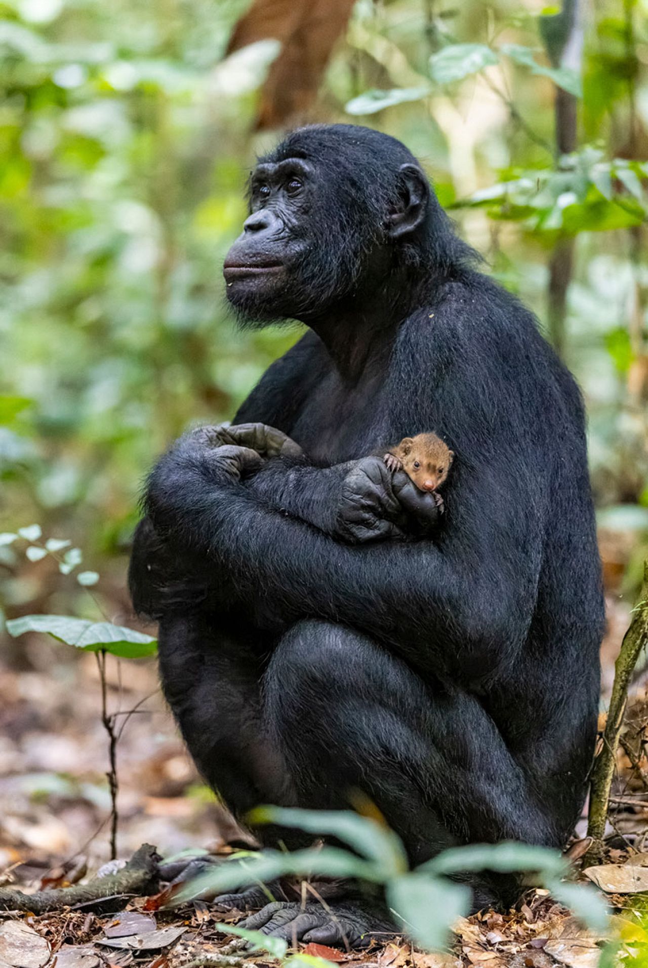 Le dernier grand singe à être décrit, le Bonobo, est l’un de nos plus proches parents vivants. Ici, un Bonobo sauvage qui a attrapé un bébé mangouste s’en occupe comme d’un animal de compagnie. Il a ensuite relâché l’animal sain et sauf. Ce comportement n’a été enregistré qu’une seule fois auparavant par le professeur Barbara Fruth sur ce site.