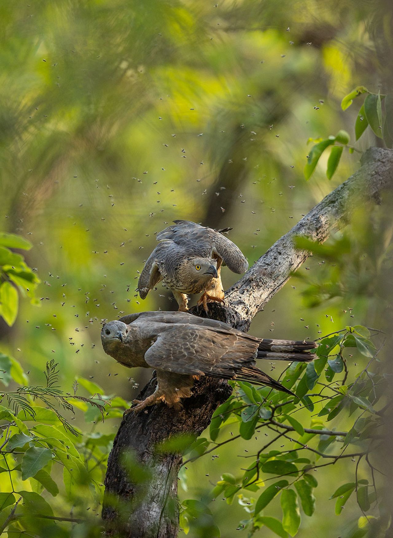 Dans les forêts denses de Satpura, un couple de buses orientales à miel attaque une ruche. Ces rapaces chassent pour se nourrir dans les ruches et les nids de guêpes mais, contrairement à ce que leur nom l’indique, ils préfèrent les larves d’abeilles et de guêpes au vrai miel.