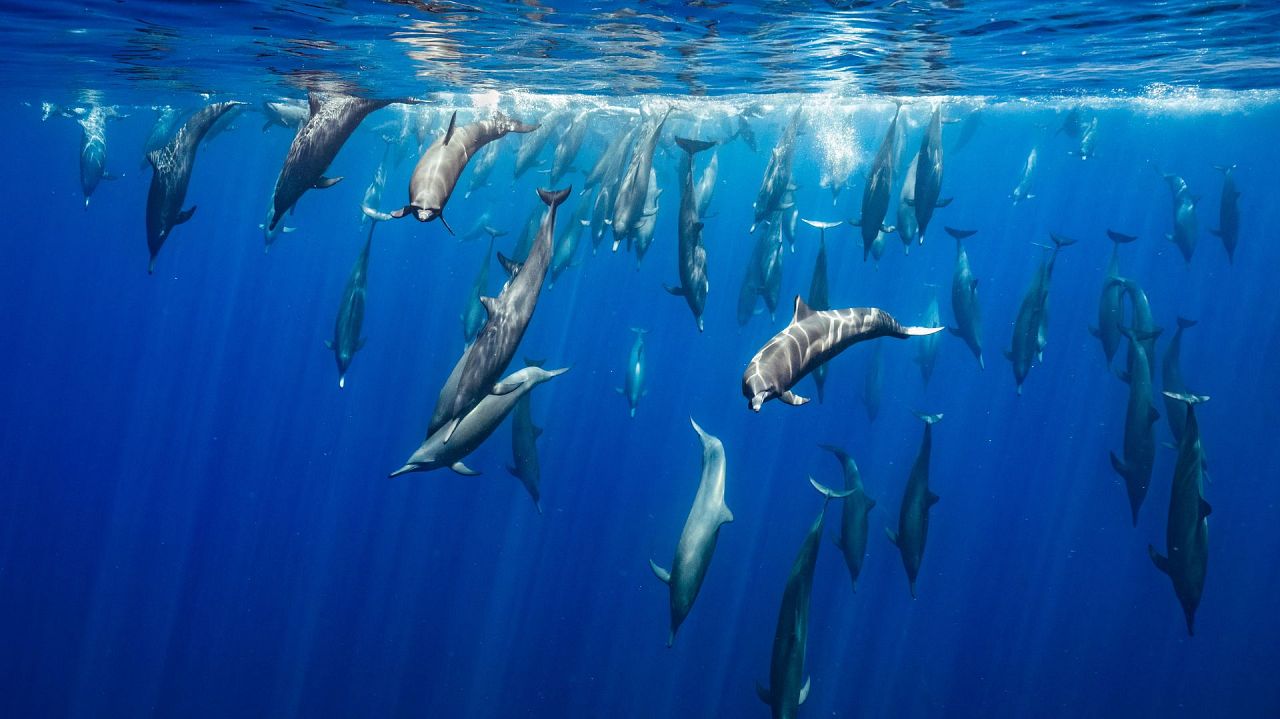 Un groupe de dauphins à long bec replonge dans les eaux magnifiquement éclairées de l’océan Pacifique, créant cette scène époustouflante d’avalanche de cétacés. On peut voir l’un des dauphins regarder dans l’objectif de la caméra, ajoutant une touche de curiosité et de connexion au cadre.