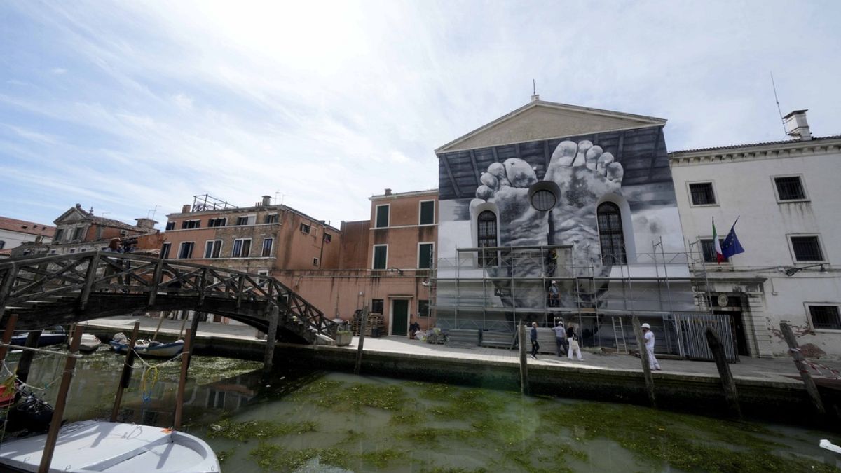 Une paire de pieds en noir et blanc est peinte sur la façade de la chapelle de la prison de l’île de la Giudecca à Venise. L’artiste italien Maurizio Cattelan est responsable de ces coups de pinceau plus grands que nature, qui expose l’œuvre d’art mural jusqu’en novembre dans le cadre de la Biennale de Venise 2024.