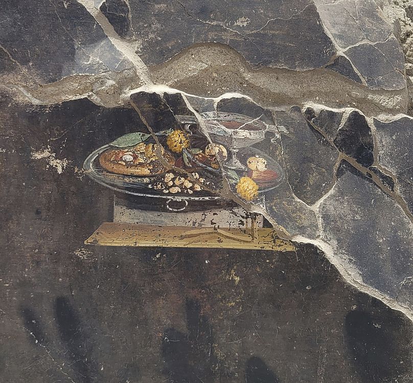 Pompéi est à deux pas de Naples, la ville de la pizza, mais les ingrédients clés pour la préparation du plat emblématique de l’Italie – les tomates et la mozzarella – n’étaient pas disponibles lorsque la fresque a été peinte il y a quelque 2 000 ans.