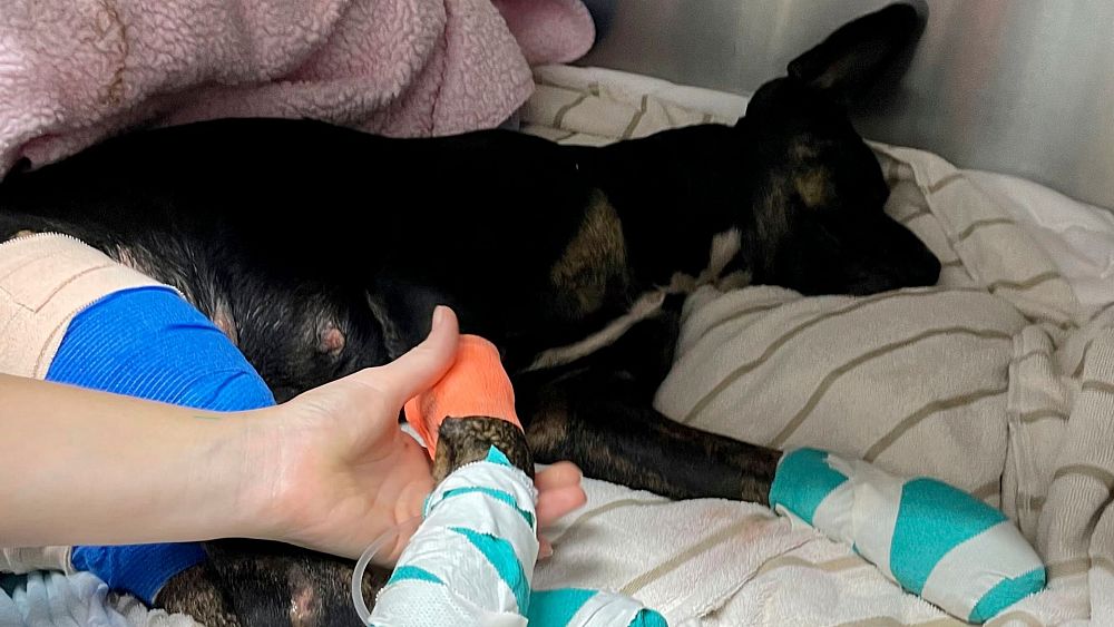Un chien avec ses pattes arrière bandées étroitement de la patte à la hanche gémissait de douleur à travers un cône médical en plastique, sa poitrine se soulevant et s’abaissant rapidement dans des respirations peu profondes.