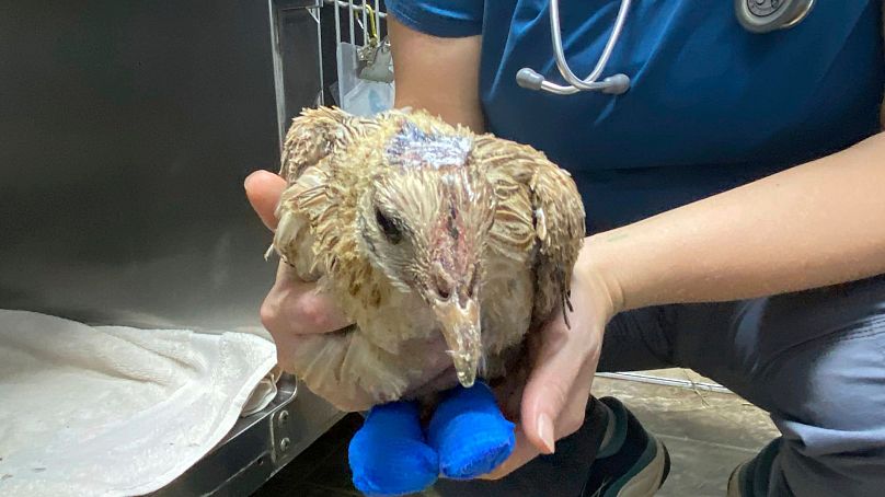 Un chat est arrivé avec une fourrure brûlée et des taches de brûlures aux jambes. Un poulet avait besoin de ses deux griffes brûlées enveloppées d’un épais ruban médical bleu.