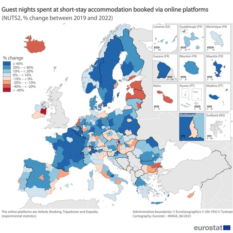 Et les derniers chiffres d’Eurostat montrent que le «tourisme de plateforme», comme on l’appelle, continue de se répandre à travers le continent. Le nombre de nuitées passées dans des logements locatifs à court terme a augmenté de 7 % pour atteindre 547 millions l’an dernier, contre 512 millions en 2019.