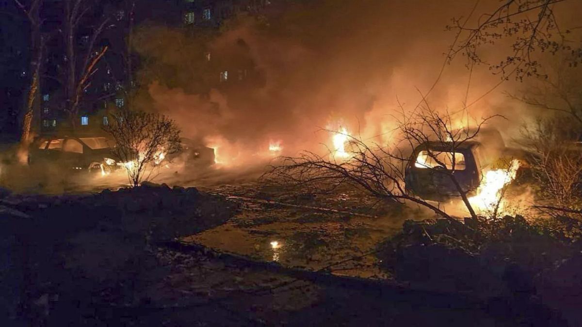 Cars burn following a Russian attack in Dnipro, Ukraine.