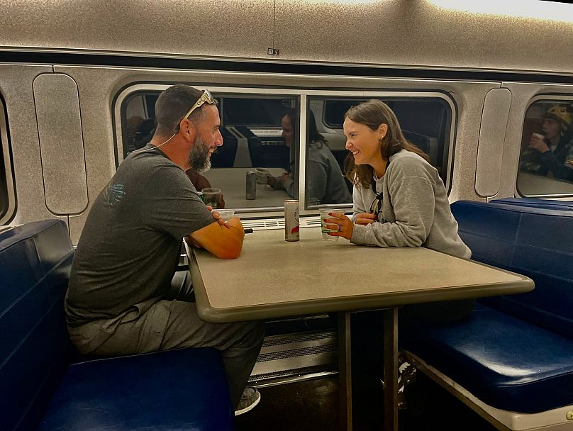 Linda et Paul, un couple de Melbourne, en Floride, se rendant à Washington, DC, pour leur dixième anniversaire de mariage, se sont approchés du bar depuis l’arrière du train. S’adressant à L’Observatoire de l’Europe autour d’un verre de vodka et de limonade, Linda était curieuse de connaître les perspectives européennes sur les élections – son mari l’était moins.