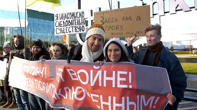 Des ressortissants russes protestent contre l'invasion de l'Ukraine lors d'un rassemblement à Helsinki, la capitale finlandaise, le 17 novembre 2024.