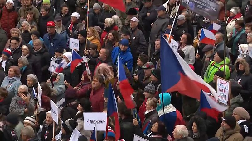 Des citoyens tchèques protestent contre le montant d'argent envoyé à l'Ukraine à titre d'aide lors d'un rassemblement à Prague, le 17 novembre 2024.