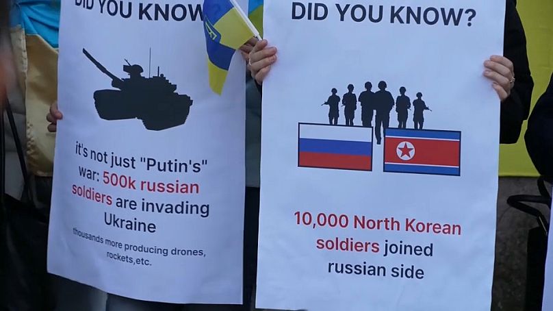 Des manifestants brandissent des pancartes lors d'un rassemblement de soutien à l'Ukraine à Rome, le 17 novembre 2024.