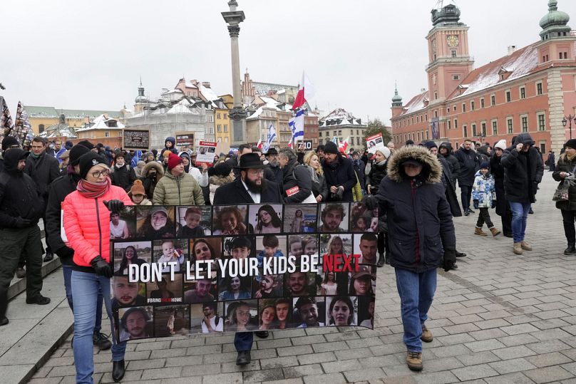Dimanche, à Varsovie, la capitale polonaise, un rassemblement de soutien à Israël auquel ont participé des milliers de personnes a exigé la libération de plus de 240 otages israéliens capturés le 7 octobre par le Hamas.