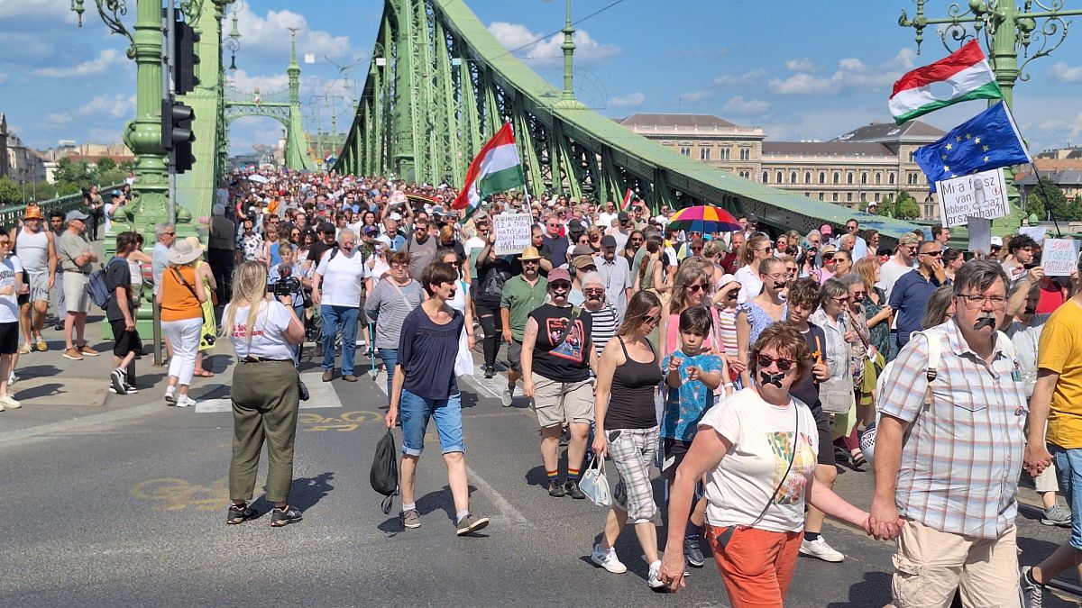 À Budapest, des manifestants se sont rassemblés sur Fővám Square dimanche après-midi avant de marcher silencieusement à travers le pont Freedom.