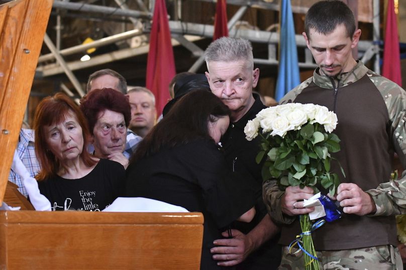 Les proches pleurent le cercueil de l'ancienne députée nationaliste ukrainienne Iryna Farion lors d'une cérémonie funéraire dans l'église Saints-Pierre-et-Paul de Lviv, en Ukraine