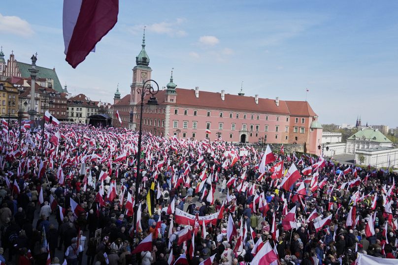 La marche des milliers de personnes a été soutenue par le parti Law and Justice, les populistes conservateurs qui gouvernaient la Pologne pendant huit ans jusqu’en 2023, lorsqu’un Premier ministre pro-européen centriste Donald Tusk a pris le relais.
