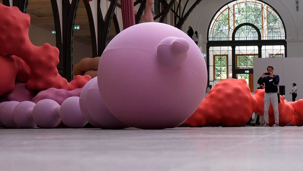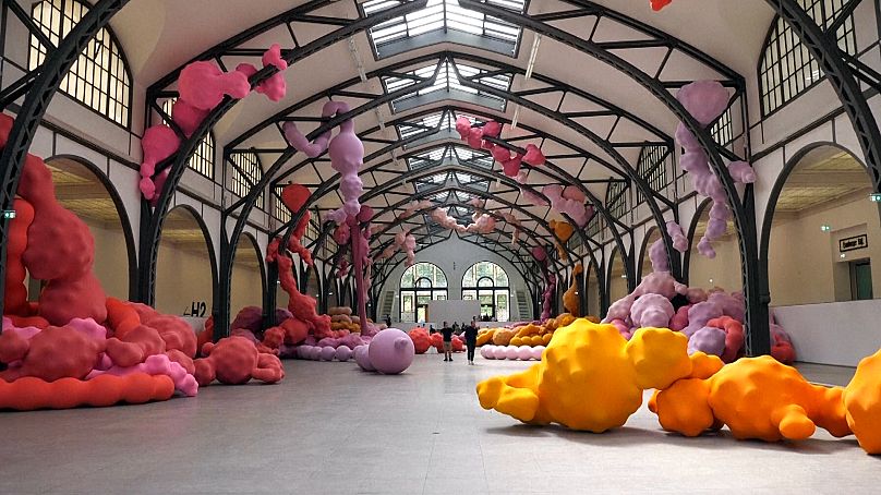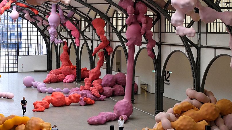 Environ 70 sculptures colorées gonflables sont exposées – certaines sur le sol, mais beaucoup grimpent sur les murs jusqu’au plafond, apprivoisant l’espace.