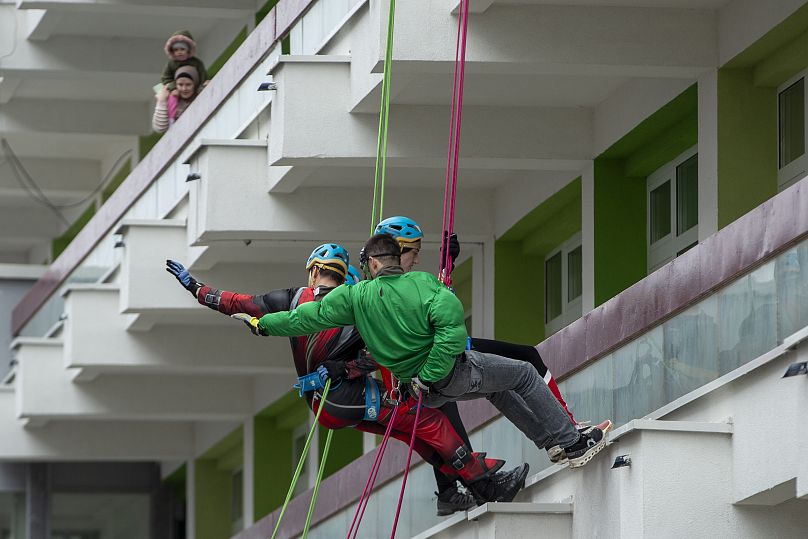 Les volontaires ont grimpé sur le côté de l’hôpital à l’aide de cordes et se sont ensuite rendus dans la salle pour livrer des cadeaux.