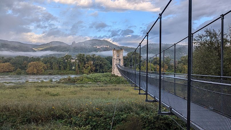 La deuxième journée s’est levée sèche et ensoleillée. Nous avons quitté le village via un pont pittoresque de style himalayen enveloppé dans la brume matinale et avons continué vers le sud le long du Rhône – avec une balade à vélo de 68 km devant nous.